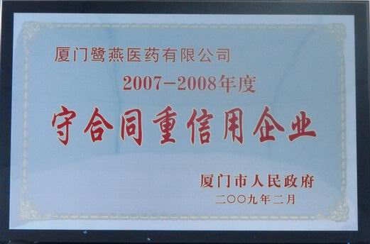 近日,廈門鷺燕醫(yī)藥有限公司、廈門鷺燕大藥房有限公司在廈門市工商行政管理局組織的 “廈門市2007—2008年度‘守合同,重信用’”評(píng)比活動(dòng)中榜上有名,這是鷺燕集團(tuán)旗下子公司繼05-06年度之后再次獲此殊榮。