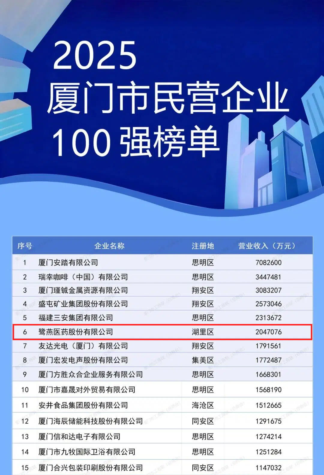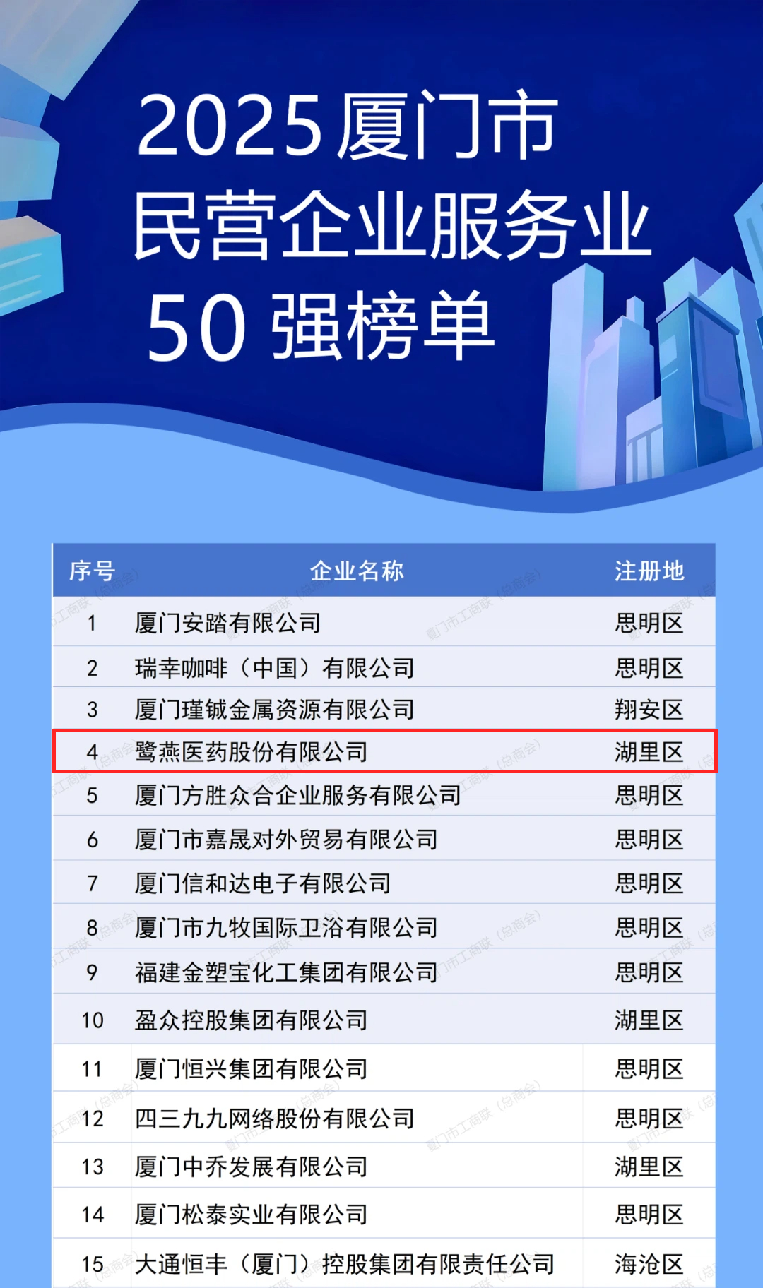 11月1日上午,2025年廈門企業(yè)家日大會召開。大會發(fā)布了2025廈門市民營企業(yè)100強系列榜單,介紹了廈門市民營經濟發(fā)展態(tài)勢和營商環(huán)境建設成效。鷺燕醫(yī)藥股份有限公司憑借上市企業(yè)綜合實力,榮膺“2025廈門市民營企業(yè)100強”第6位,以及“2025廈門市民營企業(yè)服務業(yè)50強”第4位。