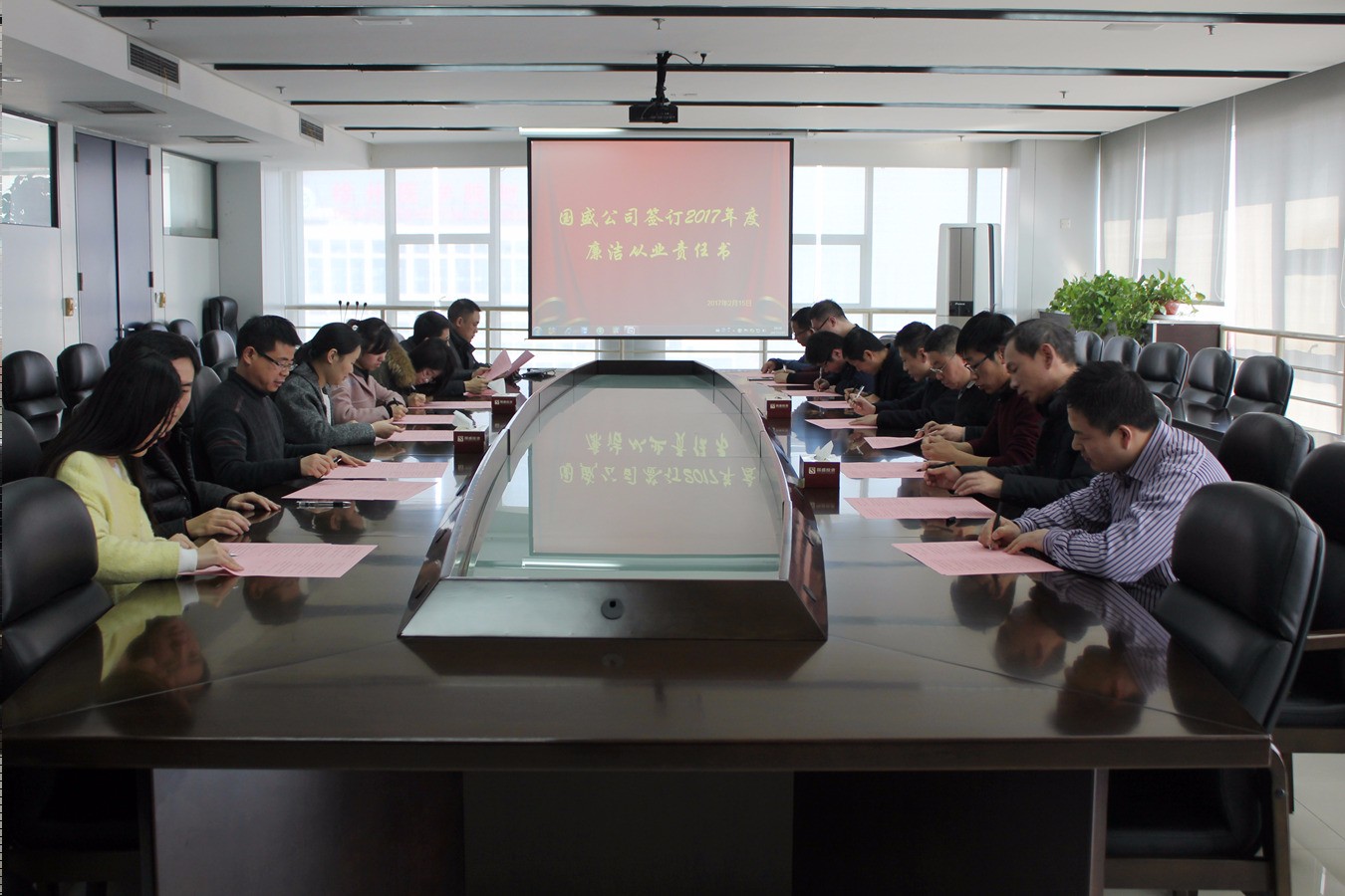 為進一步強化反腐倡廉建設(shè),引導(dǎo)公司干部職工正確對待和行使手中的權(quán)利,不斷提高廉潔自律意識,國盛公司結(jié)合實際情況,制定廉潔從業(yè)責(zé)任書。公司董事長趙麗、總經(jīng)理李中亞、副總經(jīng)理宋超等高管,中層管理人員及重點崗位人員于2月15日簽訂了責(zé)任書。